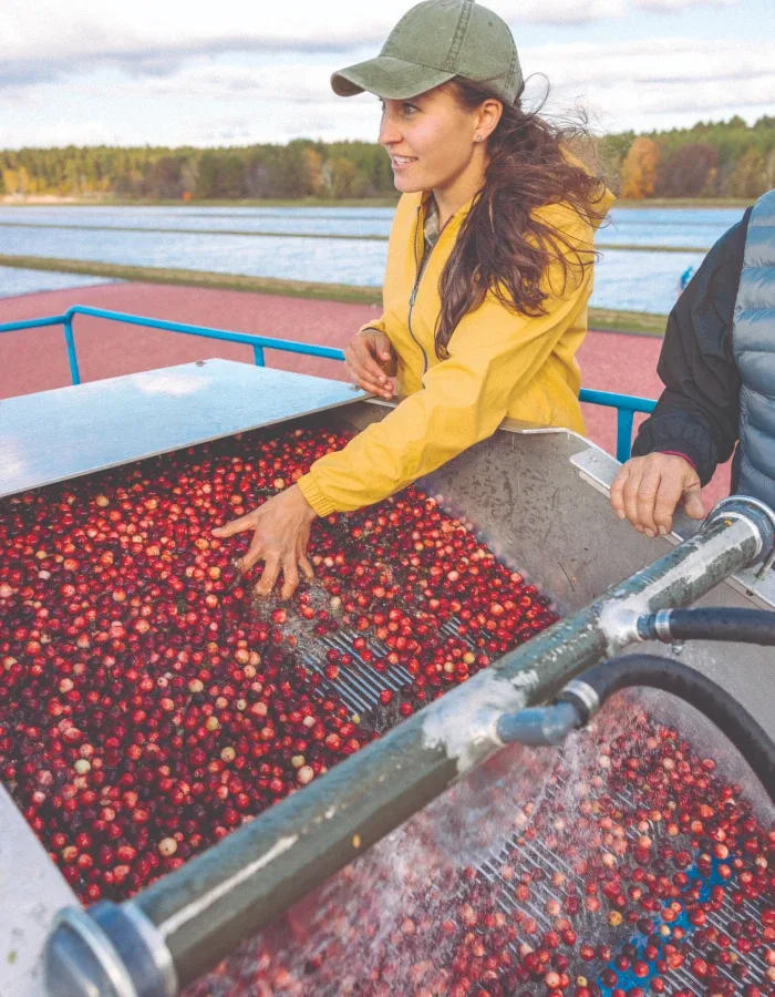 Les producteurs utilisent ensuite des machines de récolte spécialisées pour remuer l’eau et retirer les cranberries de la vigne. Chaque baie possède de minuscules poches d’air qui lui permettent de flotter à la surface de l’eau.